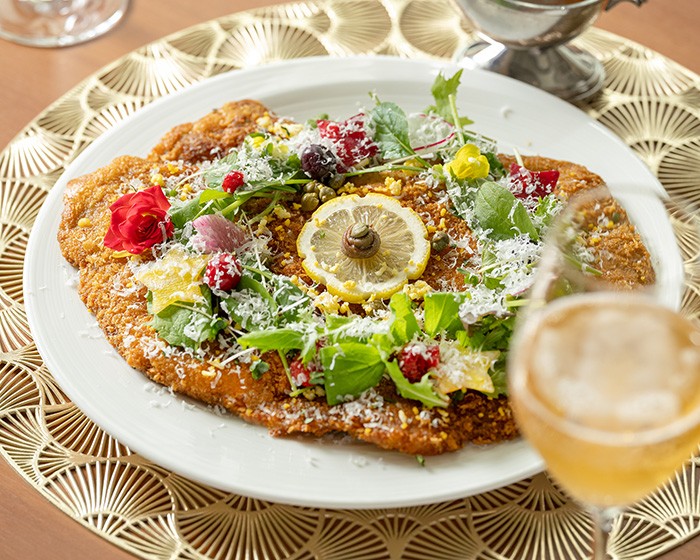 9,000円(グラスシャンパン2杯付き)おすすめのウィンナーシュニッツェルをクリスマスリースに見立ててご提供。クリスマスだけの限定メニューです。