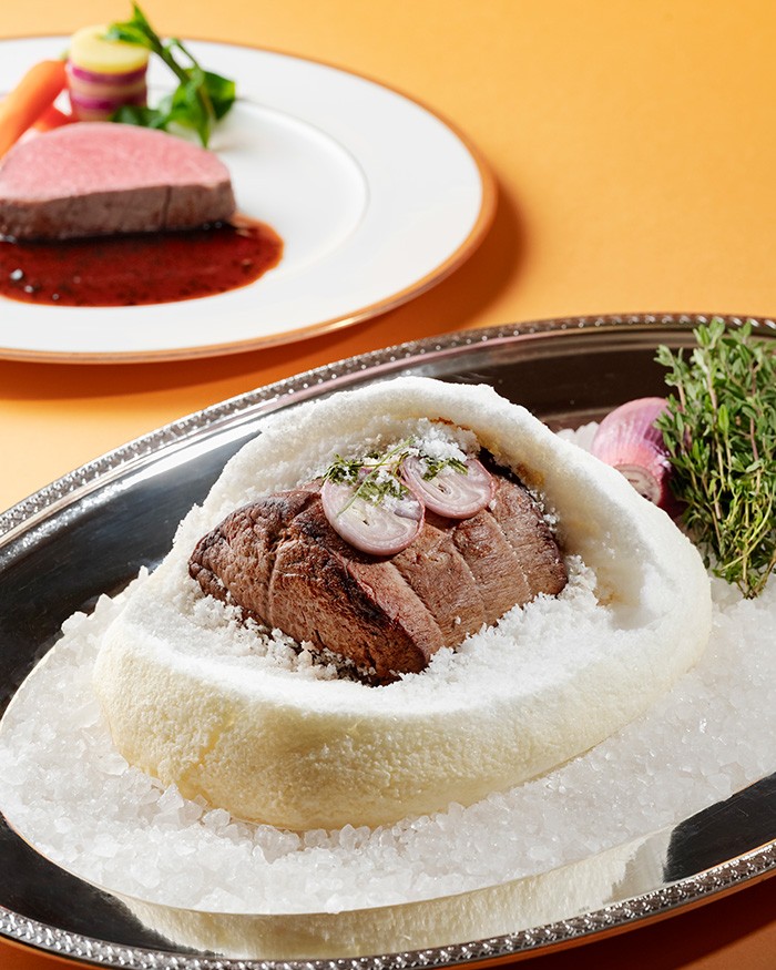 - 【絶対の一品】九州産和牛フィレ肉の塩釜包み焼き 香草風味 黒トリュフ香るペリグーソース