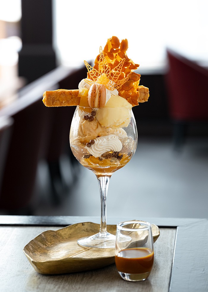 洋梨と相性のよいキャラメルを合わせたジェラートやコンポートなど10種類以上の層が重なるパフェ。