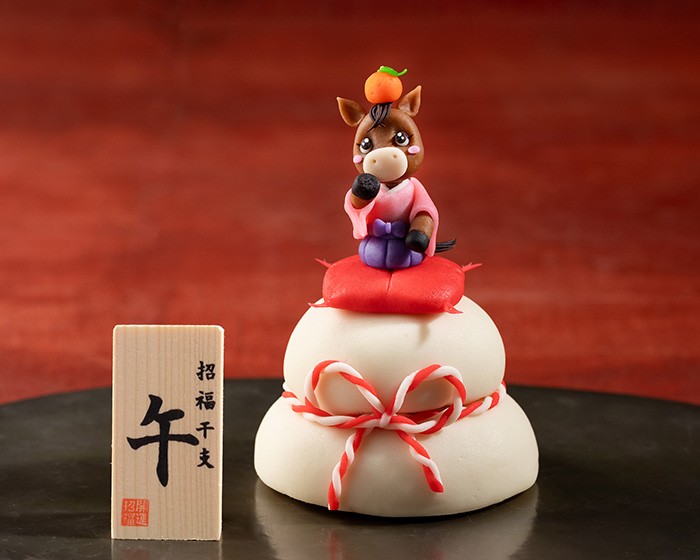 1個 6,600円 (高さ 13㎝)ミニ鏡餅の上に、2026年の干支「午」がみかんと一緒にちょこんと座った観賞用工芸菓子です。