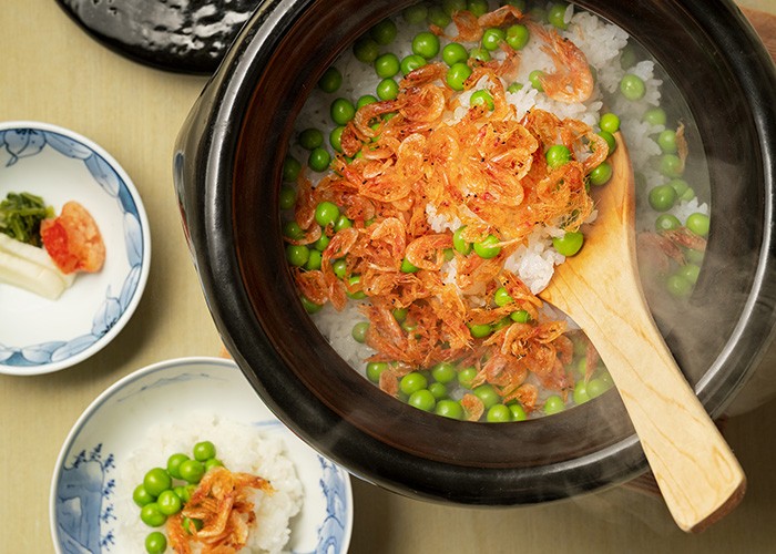 2合 3,200円春色の桜海老と碓井豆が美しく炊きあがった御飯を「混ぜて」お召し上がりください。