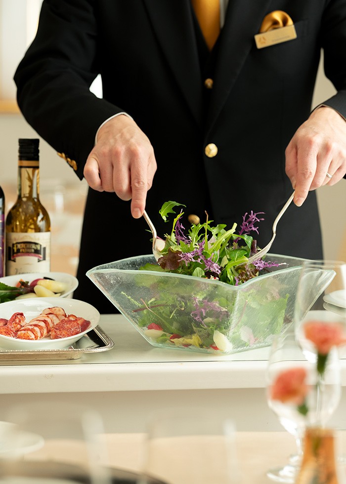 1名様 17,000円「混ぜる」メニューは、目の前で彩り豊かなサラダを混ぜ合わせオマール海老とホワイトアスパラガスを添える1品。母の日に心に残るひと時を演出します。