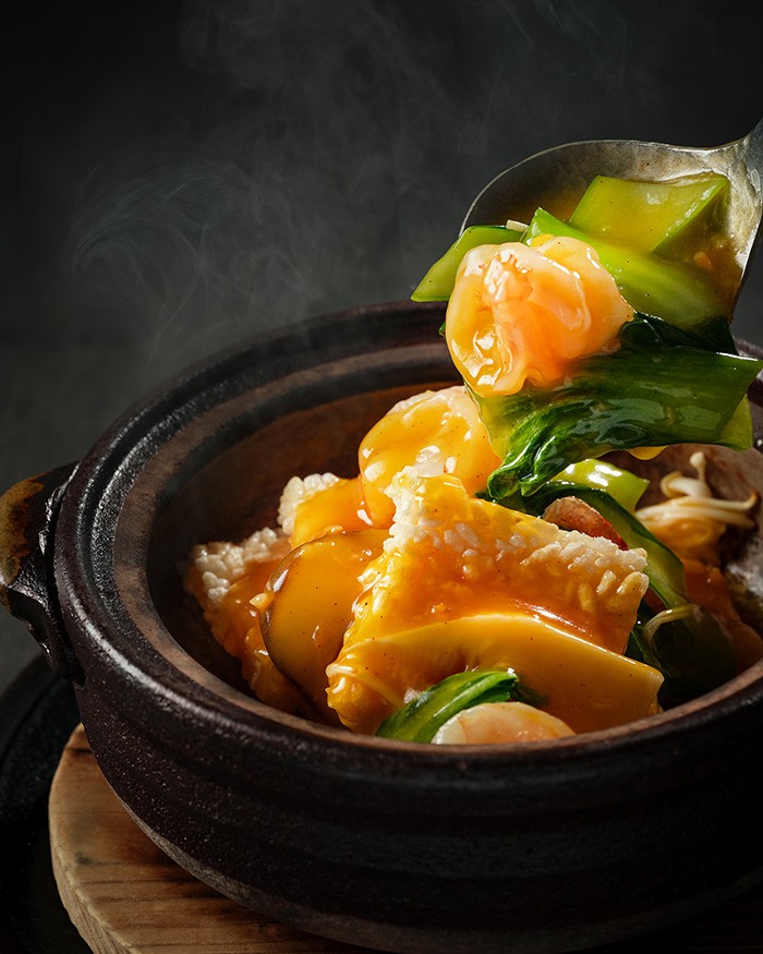 海老と青菜のおこげは、「混ぜる」ごとに心躍る音や香りまで楽しめる一品です。デザートにはもちもちの杏仁豆腐とマンゴーソースを「混ぜて」ご賞味ください。